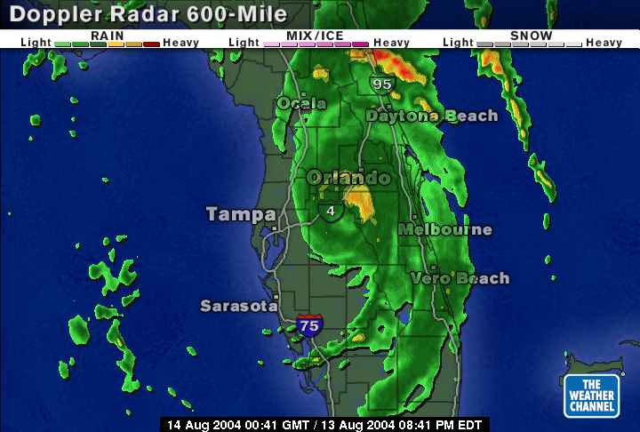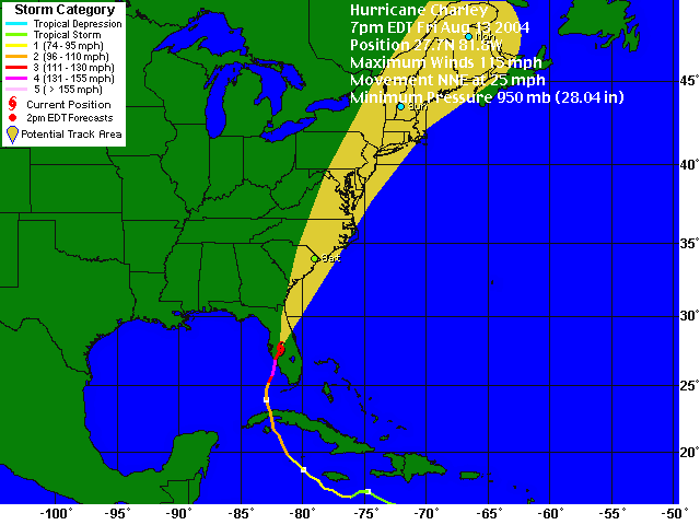 The 7 PM position and forecast for Charley. The center arrived here around 9:45 PM |