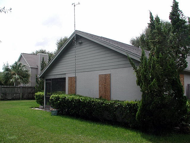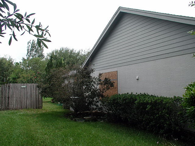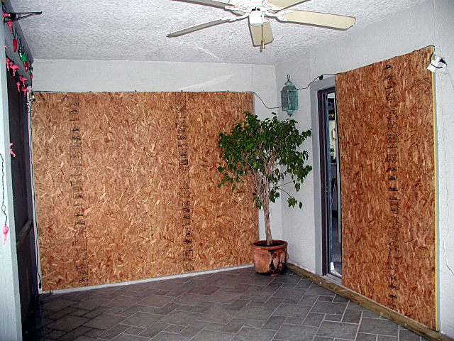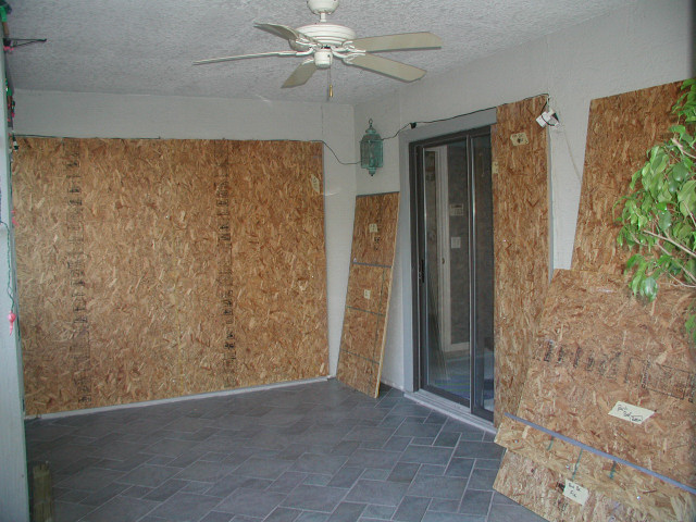 The garage. Plywood ready for boarding up, and my motorcycle tucked away in the back so I can get my SUV in the garage.