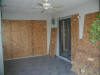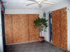The large patio door, boarded up, and a start on the other, with the wood ready for some other windows.